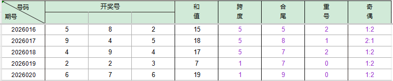 2026016期开奖号码582,我们可以看出近30期百位5出现5次,十位8出现3次(较017期减一),个位2出现6次。