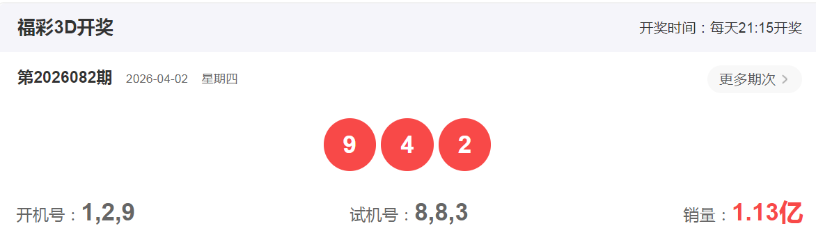 福彩3D2026年4月2日第082期开奖号码是942,和值15,跨度7,大小小,组六形态,奇偶偶