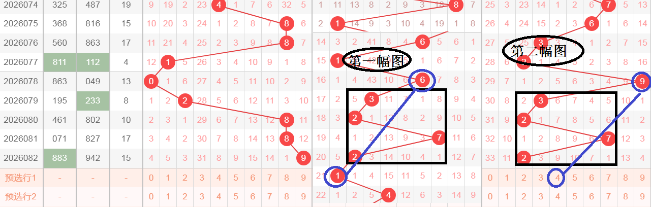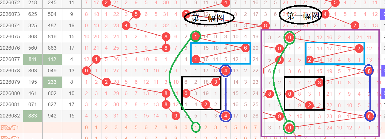这是一张叠加图,利用个位来分析十位,为了方便分析,我把图分成了第一幅图和第二幅图,第一幅图是个位,第二幅图是十位,在个位和十位同样出现了黑颜色框302,两张图的蓝颜色线条都是直落号,两张图的青颜色框都是两码差5,都是由大到小的排列方式,那么轮到今天,十位绿颜色线条会不会和个位绿颜色线条属于直落号,文字表达不太清楚,大家可以观看上面的视频