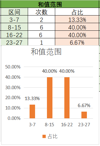 上期和值是10,处在8~15之间,各个类型占比没有变化。目前是16~228~15占比最优,然后是3~7,最后是23~27。本期看好和值在8~15之间,其次是16~22