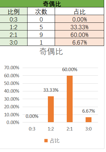 上期奇偶比为2:1,其中2:1占比变大,1:2占比变小。近15期内2:1优势最好,然后是1:2上期开了2:1奇偶比,本期还是看好2:1奇偶比的开出,其次是1:2