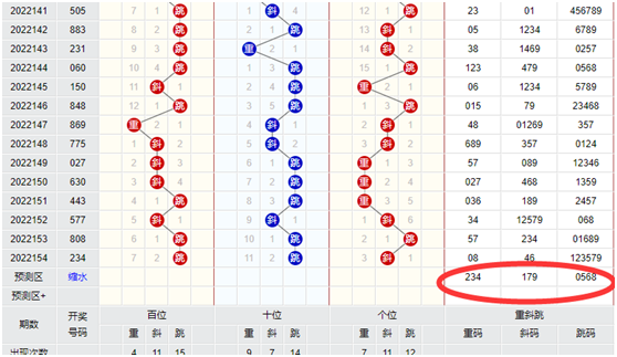 通过我们对重斜跳定义的理解,就知道155期重码就是234也就是上期的开奖号码,斜码就是179,跳码就是0568,了解完重斜跳定义之后,在来总结当期的号码排列模式,通过它们的各种排列组合,我们就能找到各种机会,这样的机会已经浮出水面了,抓住一个是一个,我们一起来探讨,重斜跳的组选形态。