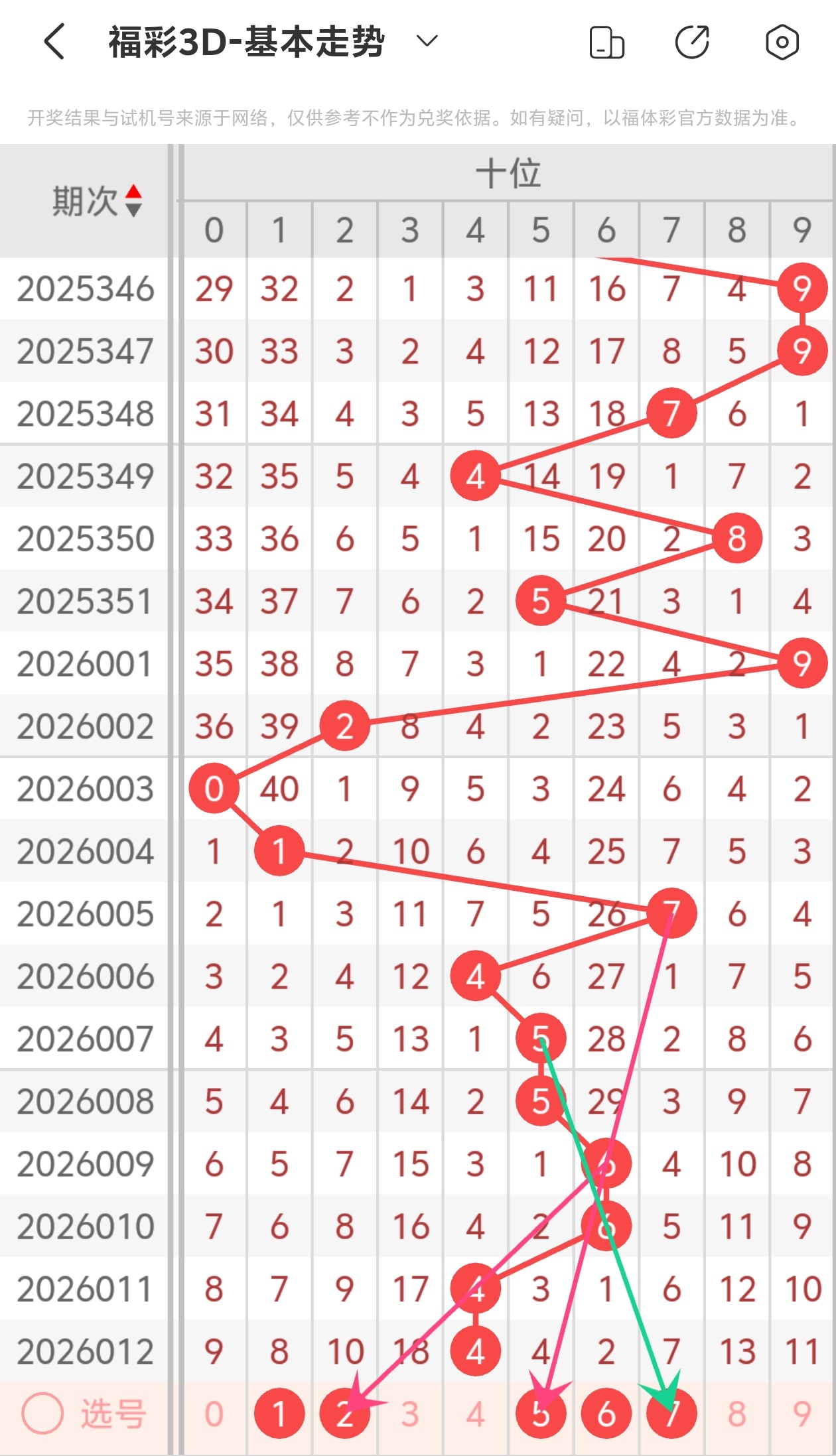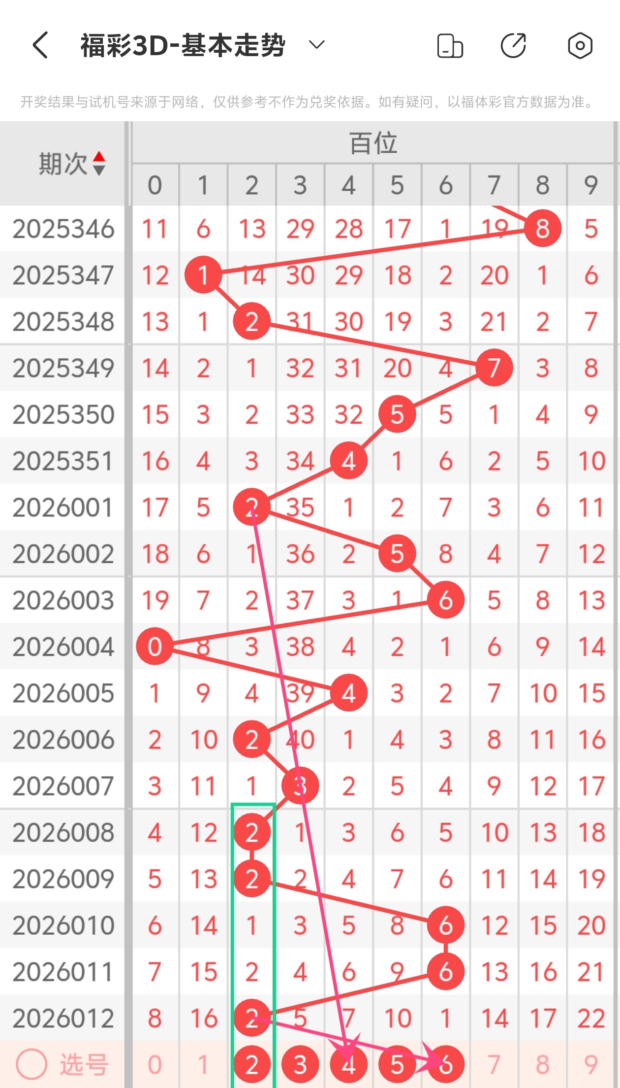 上期百位开出2,本区与上期的跨度为4,本期我们可以从上面走势图中看出选号的思路,2为对称形态走势,4为斜连走势跨度为二,6为隔期回补走势跨四,综合以上分析,本期百位推荐:23456