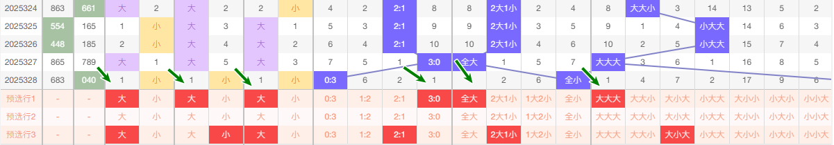 最近的5期当中十位大数出现的频次4次 小数出现1次 ,趋势平和 本期看好走大
