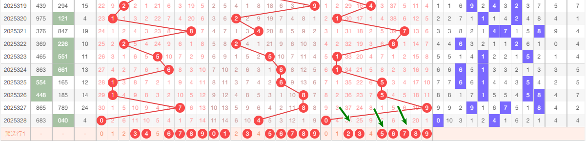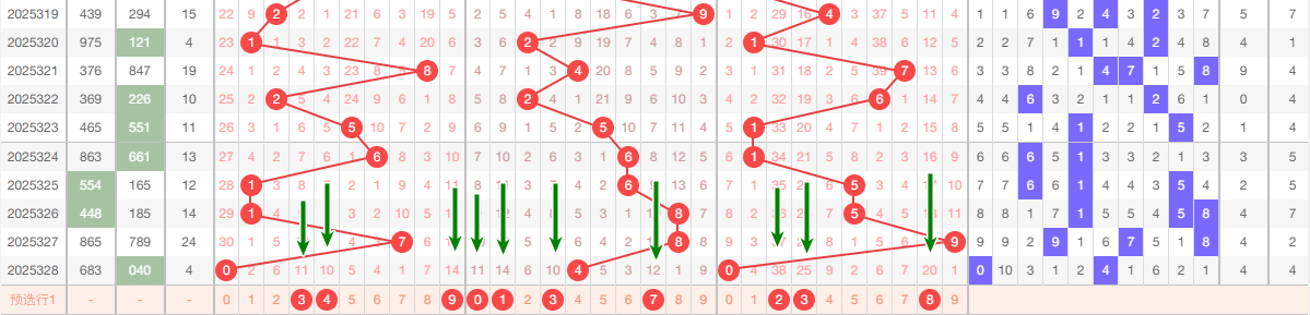 上期个位开出0,本区与上期的跨度为9,本期我们可以从上面走势图中看出选号的思路,本期 个位推荐关注:25784