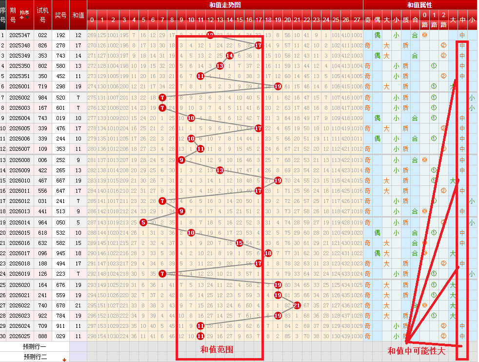 从上图可以开出,按和值大(18-27)中(9-17)小(0-8)分区,上期开出和值中,按近期趋势和跟随表现,本期继续和值中可能性大,和值大致在9-17间。