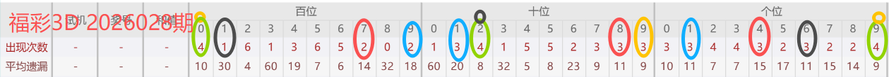 2026026期开奖号码099,我们可以看出近30期百位0出现4次,十位9出现3次,个位9出现4次。