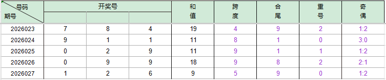 2026027期开奖号码126,我们可以看出近30期百位1出现1次,十位2出现4次,个位6出现3次。