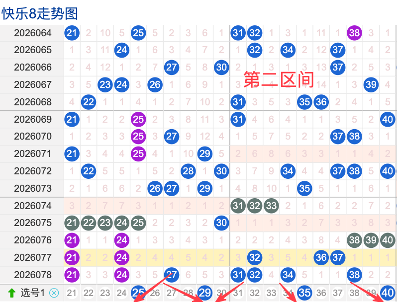 上期二区开出7个奖号(21.24.27.31.32.34.38)上期回顾二区开出7个奖号二区间在上期落位同比前期的话呈现了一个递增的落位趋势,先来看本期号码25整体活跃度较稳定,在近 30 期里有一定的间歇性出现,不是每期都开,近期整体走势还是很稳定。号码29近期热度较温冷,间隔性整体比较冷,说明其在当前阶段活跃度较冷注意防守。号码35近期活跃度较温热有一定的间歇性近期整体走势相对还是很稳定有特别明显的冷热趋势变化,号码40近30期内活跃度较温热,没有明显的连续出现形态走势,整体表现比较温热。