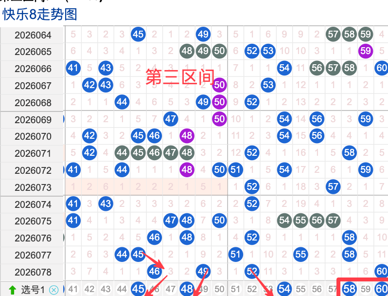 三区间开出了4个奖号(46.49.52.60)上期回顾三区开出4个奖号上期的三区间的奖号数量呈现一个递减的形态,4头开出2个号码,本期先来看号码45期出现频率相对来说还是很稳定。偶尔有时间隔期数也是很长,但是在近期的开奖中较热,号码48在近 30 期内出现次数相对较稳定的号码,近期的活跃度也是较热。号码54有一定的间歇性,通常间隔5-3期会出现一次,没有明显的连续出现态势,走势相对还是很稳定,在整个第三区间的表现较热本期还是可以防守的。号码58走势相对近期较热,近期没有连续间隔落号的情况,活跃度近期处于热状态注意防守。