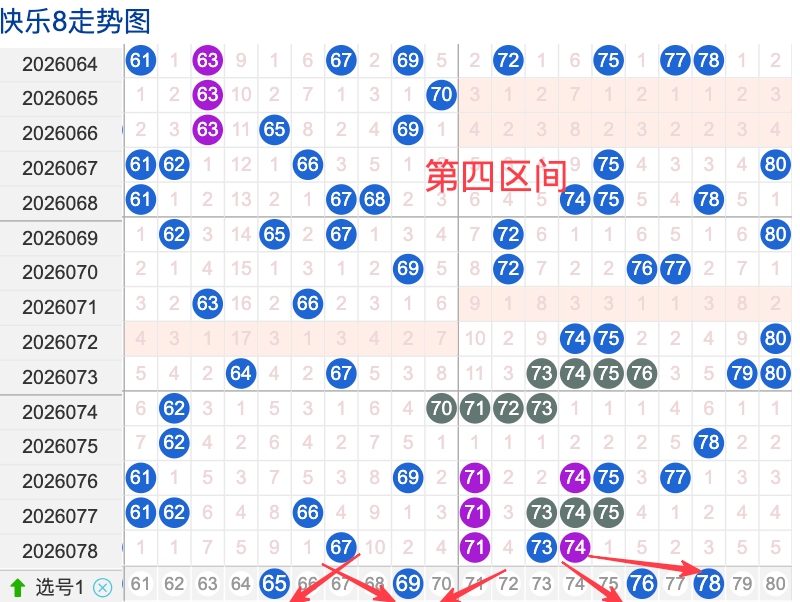 上期四区间开出了4个奖号(67.71.73.74)上期的四区开4个奖号呈现了一个递减趋势,开出的奖号6头回补1码,7头回补3码,先来看号码65在近 30 期内属于还是很稳定的号码,近期出现频率相对热,偶尔会间隔多期后出现一次,这个号码要注意防守,号码69具有一定的间歇性近期活跃度还是很稳定比如有时会间隔3到5期就再次出现,有时会间隔多期,近期整体出现频率比较热,近期还是要关注的.号码76活跃度近期比较热,有一定的间歇性,整体走势有一定的波动性.