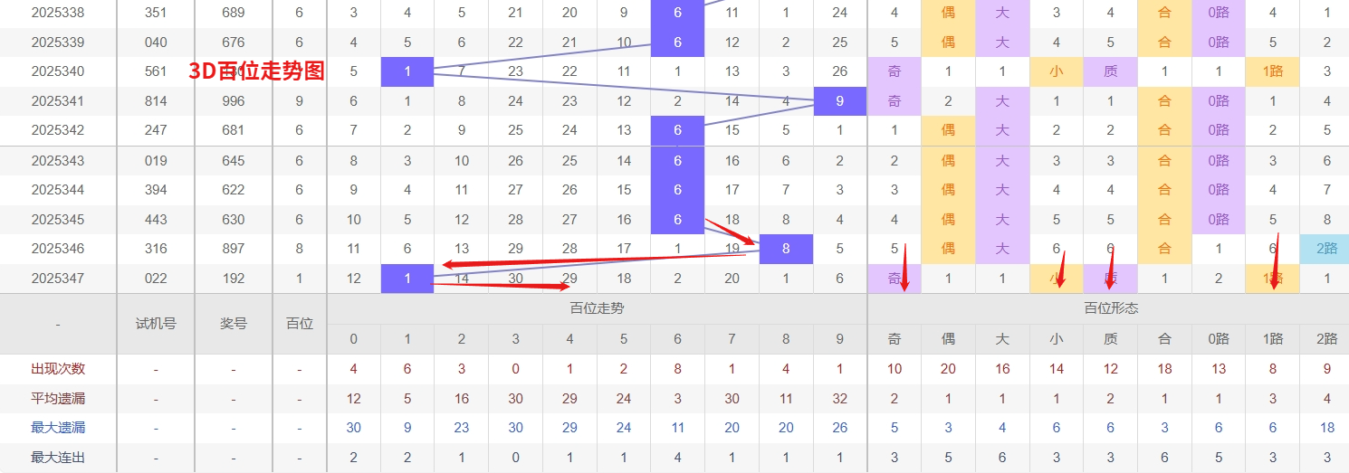 福彩3D百位分析:第2025347期百位开出号码1属于小奇数,从上面百位走势图上可以看出近100期大小比约为48:52奇偶比约为53:47。近期数据还是比较极端的符合文章开头介绍的求均衡规律非等量现象。但这种均衡不会持续最终会被偏态运行打破,然后循环往复。但短期内大小相差7点,大数过热小数有回补需求本期个人认为走小数的概率更高。上期百位落号“1”号球,在百位号码开出1路号码1后向小数方向走出7个振幅。那么通过分析上期百位落位号码分析,号码走出7个振幅,号码走为小奇数,开出1路号码1。通过对百位落号趋势来分析,百位号码落位前端,通过对近10期的走势来看百位号码大小交替频繁走2期大数又走3小数,近期3D百位走势中,数字3和4持续低温,遗漏值已逐步接近临界区间,从概率平衡与冷态回补规律来看,这两码存在较强的技术性反弹需求,短期内需密切关注其解冻信号。与此同时,数字2作为温号,近期出现频次稳中有升,形态上呈现振幅收窄、位置活跃的迹象,有较大概率向热号过渡,转热势头值得防范。综合来看,百位接下来需兼顾冷号回补与温号转热的两重可能,尤其注意冷号突然开出带动温号连续跟随的节奏变化。们在百位关注的重点在23457这5个号码球上,百位号码近期奇偶切换频繁,1号球码属于1路号码奇数,现奇数开出过多有继续向奇数的趋势。所以福彩3D第2025348期百位看好23457本文由一起彩钱是生命动力所著,请勿转载