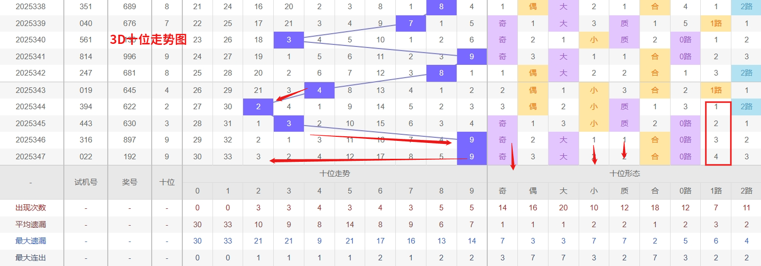 福彩3D十位分析:第2025347期十位开出号码9属大奇数号码后端。以历史100期数据为例十位奇偶比约为52比48,大小比约为51比49近期大小相差0点,根据求均衡的规律开出大数的概率比小数高一点。上期我们分析偶数经过连续回补后有走奇数的可能,开出奖号9大奇数符合我们的预期。近期3D十位走势中,数字0和1持续处于冷态,遗漏周期已逐渐拉长,从冷热平衡与概率回调的角度看,这两码具备较强的技术性回补需求,短期内需留意其可能出现的解冻信号。与此同时,数字5和7作为温号,近期出现频率趋于稳定且间隔逐渐缩短,走势上呈现热度积聚的态势,尤其在与热号交替出现的过程中,显示出较强的转热潜力。综合判断,十位接下来需同时关注冷号回补与温号转热两种走势动向,尤其需防范5和7在震荡中突然形成连续开出的热度周期。所以福彩3D第2025348期十位推荐01257。本文由一起彩钱是生命动力所著,请勿转载