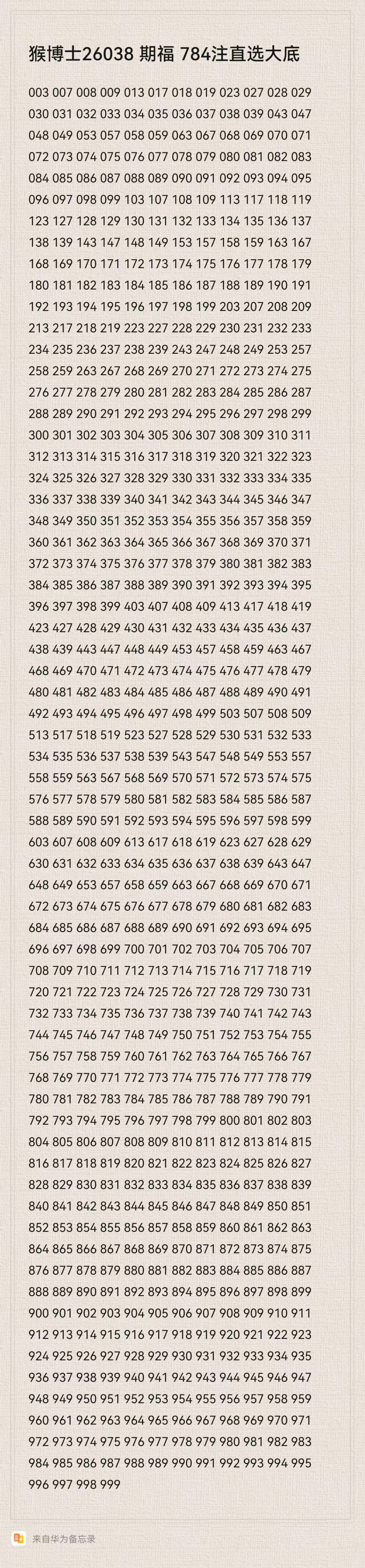猴博士26038期福784注直选大底:(可以当母底用,然后进行缩水)