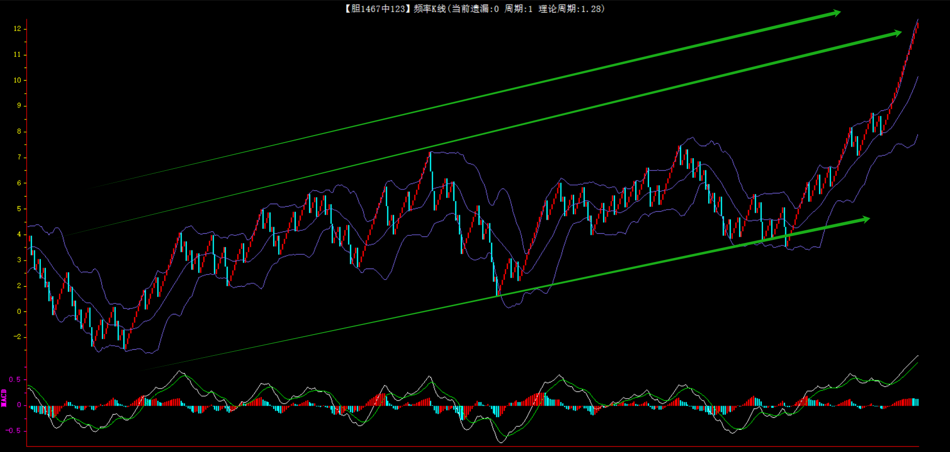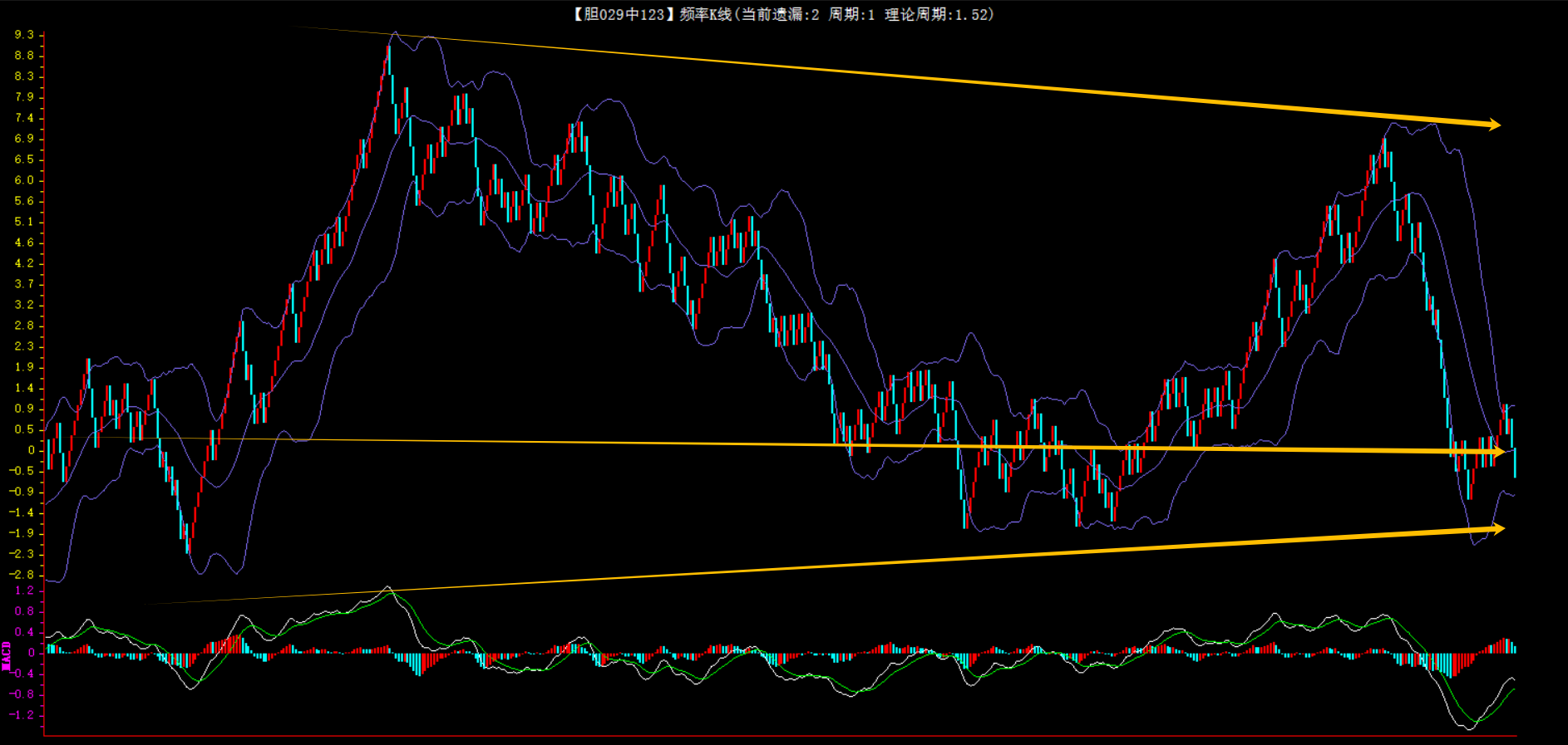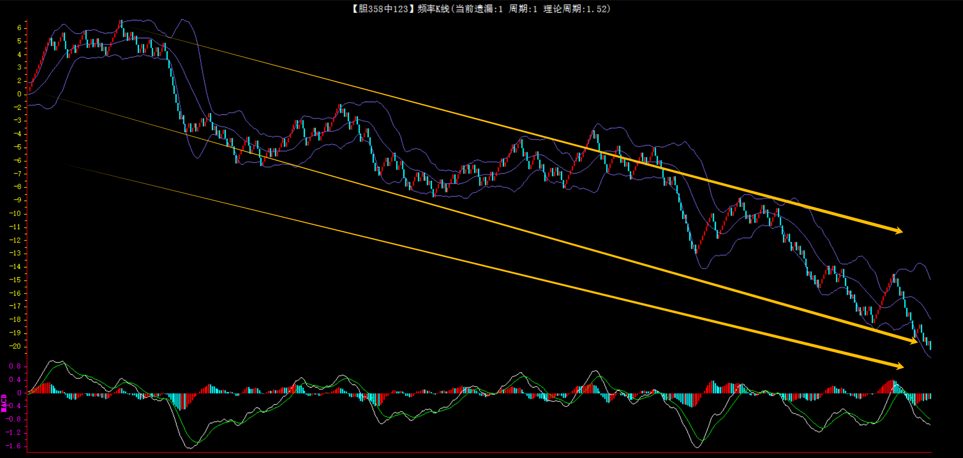 整体趋势下行,上边沿线趋势向下,下边沿趋势也是向下,节点震荡,当前遗漏1期,本期防守。