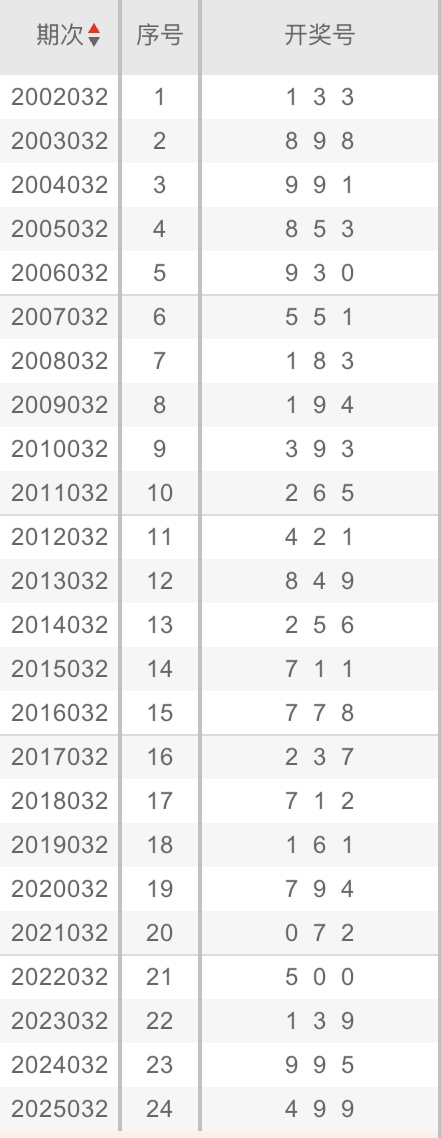 言归正传,分享第一个数据分析:统计历史同期开奖号码,依据追热不追冷的规律,出现次数最多的数字,大概率可以追热。以彩虹APP查询的历史同期开奖号码为例: