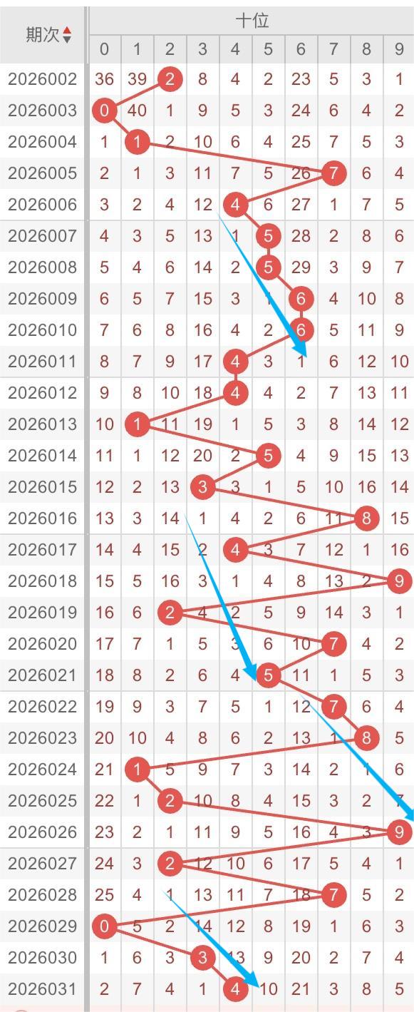 以近30期十位的走势形态分析:斜连形态多次出现。例如:数字3-4-5/7-8-9/2-3-4开出。本期重点关注:数字3-4-5斜连开出。个人分析,仅供参考。