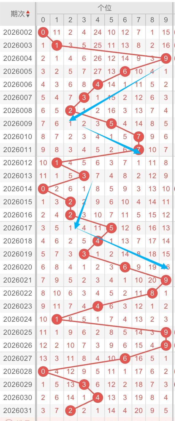以近30期个位的走势形态分析:跨度多次出现。例如:数字9-2/2-7跨度开出。本期重点关注:数字2-9跨度开出,同时关注数字2-3-4斜连开出。个人分析,仅供参考。