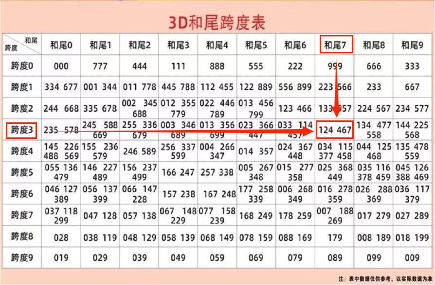 最后分享一个实用的3D和尾值与跨度值组合统计表。组合号码时,根据推测的和尾值结合跨度值,查找统计表上推荐的组合号码。以26031期为例:和值尾7、跨度值3,在统计表上查找的组合号码有:124/467,其中组合号码中出124(开奖号码142)。特别注意:统计表上推荐的组合号码,不是直选号码,不定位百十个位的顺序。仅供参考。