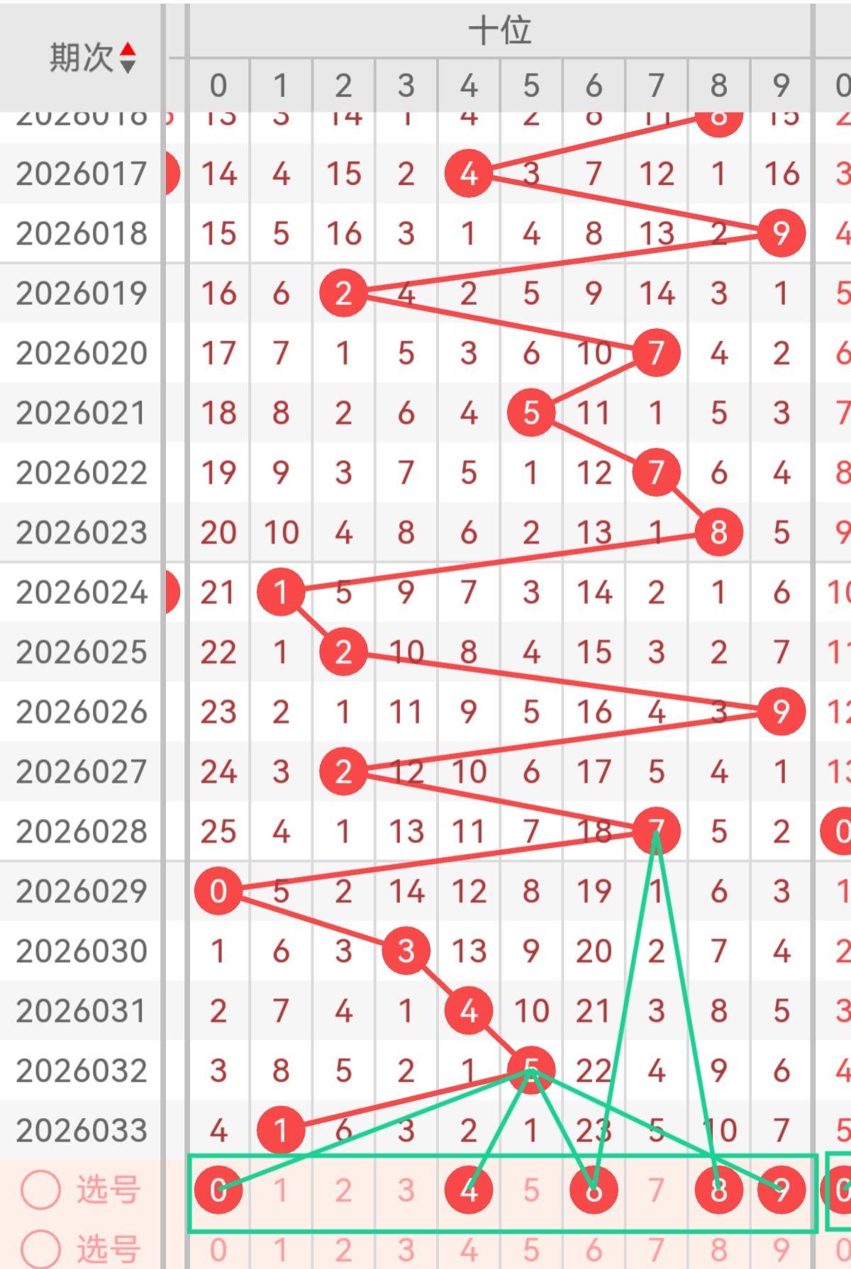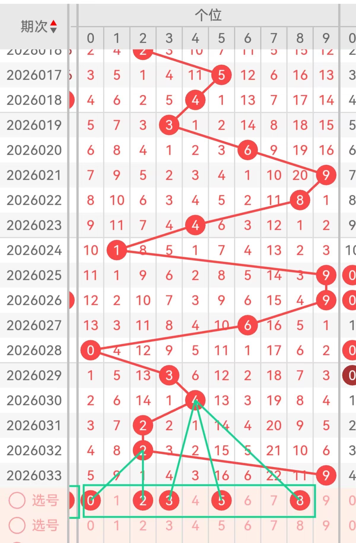 上期个位开出9,本期重点关注0、3、5,数字0是小号核心0路号,近5期个位断档,上期全奇组合后,0作为偶数龙头,回补概率极高,且0能有效降低和值,平衡上期和值11的中位走势,同时0为冷号,契合冷号回补规律;数字3是小号高位0路号,近30期个位开出4次,走势平稳,上期0路号码稀缺,3能完善012路结构,且3为奇数,搭配奇偶均衡2:1走势,形成合理组合;数字5是中号核心2路号,近16期个位未出,冷号特征明显,上期大号9独撑,5作为中号能衔接大小区间,平衡号码集中度,且5为奇数,补充奇数占比。备用号2和8均为2路偶数,2是小号中位,8是大号低位,可防范偶数集中开出。