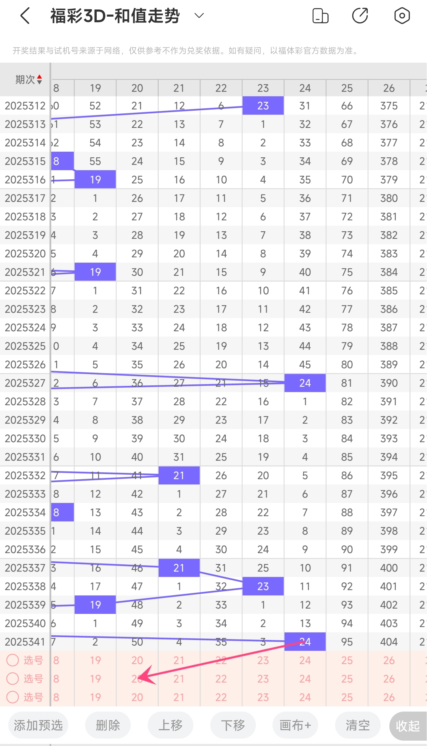 上期和值是24,往前一期和值是4。和值往右移动,偏移振幅为20。24和值也是处于近30期内开出的最大的和值。上升的空间已经很小了,下降的空间很大,本期看好和值变小,所以本期趋势是大概率往左。因此推测本期和值趋势是大概率往左的,和值变小,极小概率往右,和值变大。