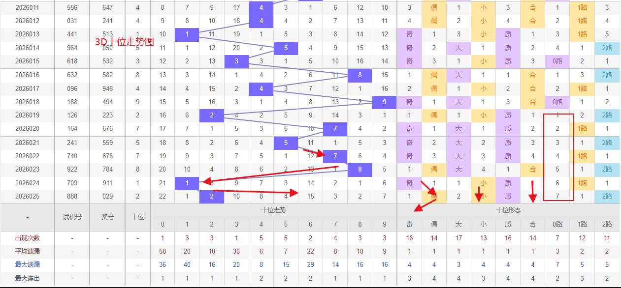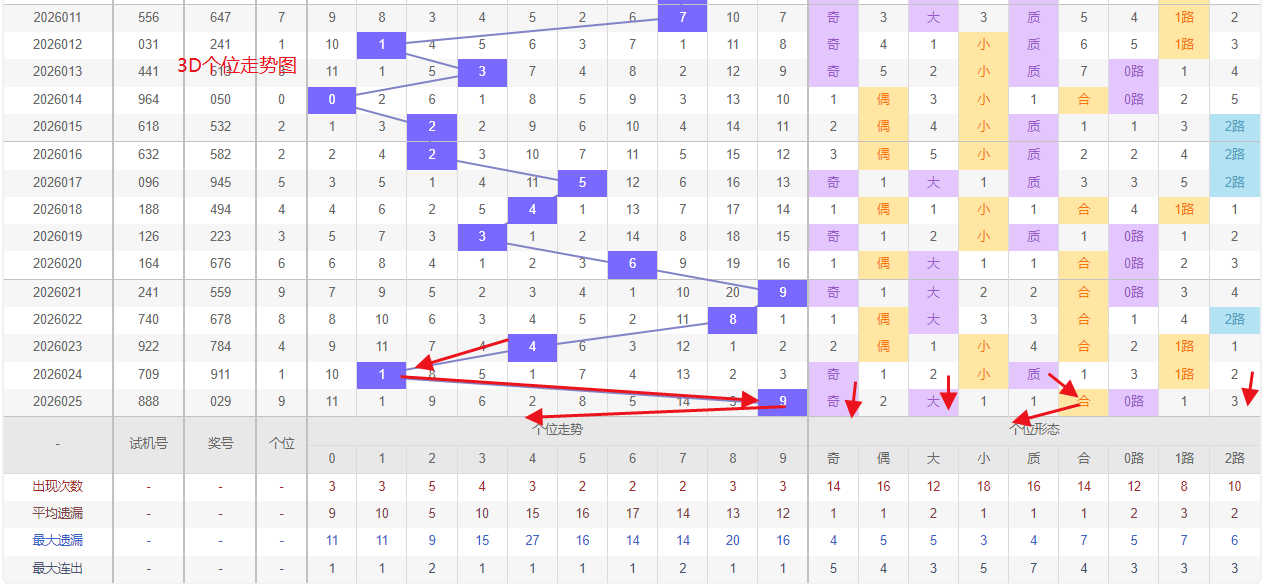 福彩3D个位分析:第2026025期个位开出号码9属于大奇数后端,从以上个位走势图中可以看出近100期的大小比约为48:52奇偶比约为55:45大小奇偶数据上有点差异有需求但不是太明显,不太好看这时就要借助连线走势和遗漏数据来帮助我们缩水号码。上期个位落号“9”大奇数0路号码球,号码开出了8振幅,连续多期的小振必被大振幅取代幅符合我们的预期,那么本期我们在个位考虑振幅走势走前依然要转变思路考虑大振幅,具体考虑(1-5)个振幅是我们主要的方向,那么在对个位落号情况进行系统的分析时我们可以明显的看到个位号码走势呈现大范围震荡,尤其是在号码的落位特点上表现的尤为突出,那么本期我们在个位分析时就要注意号码的风险,避免出现踏空。3D个位近期走势分析,数字5已进入明显的冷态周期,其遗漏值持续攀升,从概率均衡与冷热转换的规律来看,冷号蓄力越久,其回补的动能往往越强,因此对冷号5的反弹需保持高度关注,并留意其可能以单期或间隔形式出现的回补信号。与此同时,数字2呈现出稳定的热态,多次开出显示其短期表现强势,但热号持续走热后,往往会面临能量衰减与阶段性转折,因此福彩3D第2026026期个位看好02458。