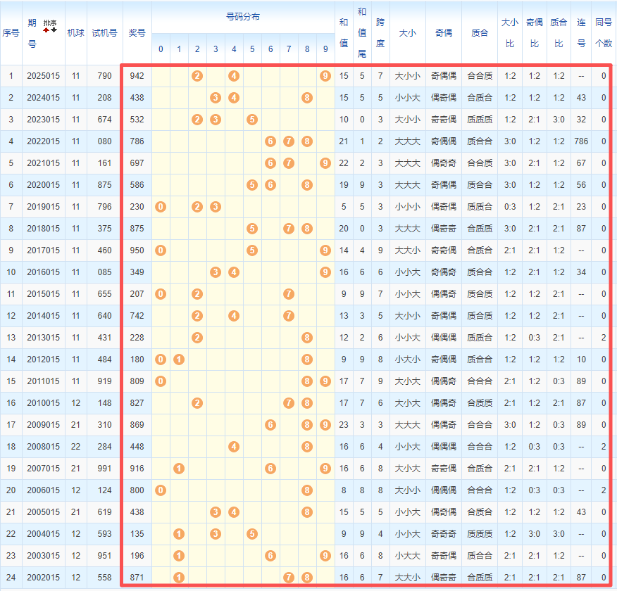 近23期开奖遗漏值分别为13 4 24 2 13 15 4 3 3 2 11 16 14 27 8 7 16 14 0 8 5 11,奇偶属性分别为:奇偶奇偶偶偶奇奇偶奇奇偶奇偶偶奇偶奇偶偶偶偶奇奇,奇后可能出偶,而偶数遗漏值的有01249,本期可以考虑一下。
