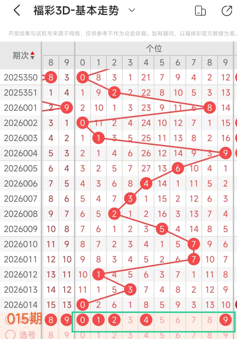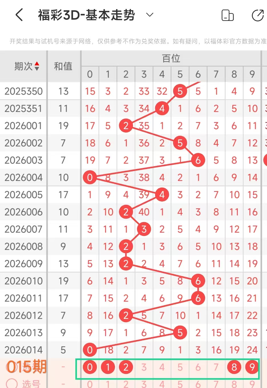 我们选取上期开奖号码050、在一起彩APP上截取前100期的数据,分别记录当开出百0、十5、个0、后下期开出什么号记录下来,然后一一分析。