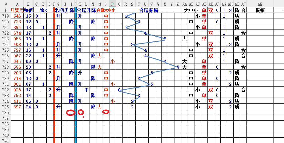 如上图3,和值升降平分析,和值升概率大,小于24和值