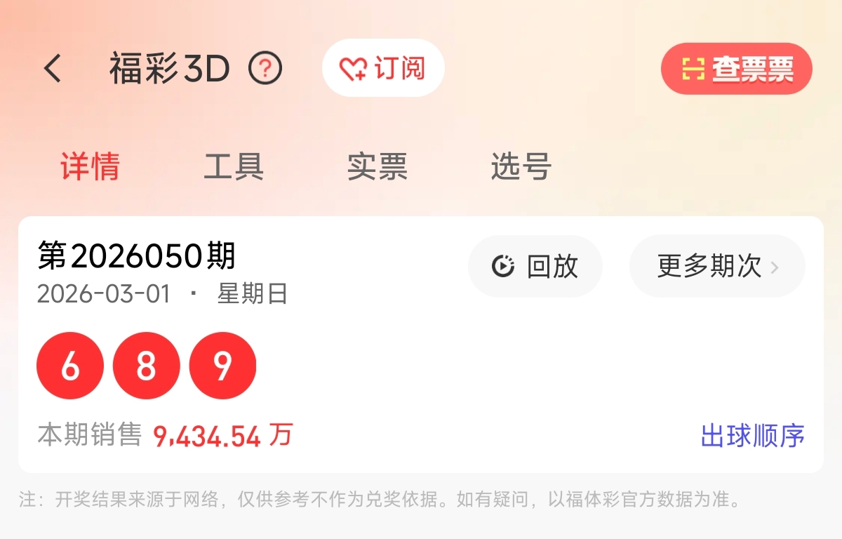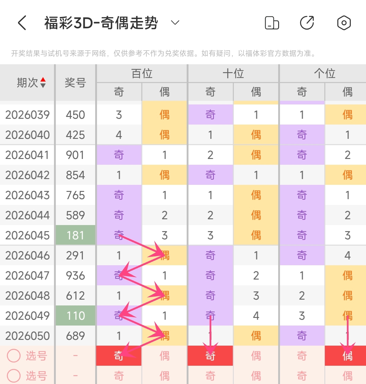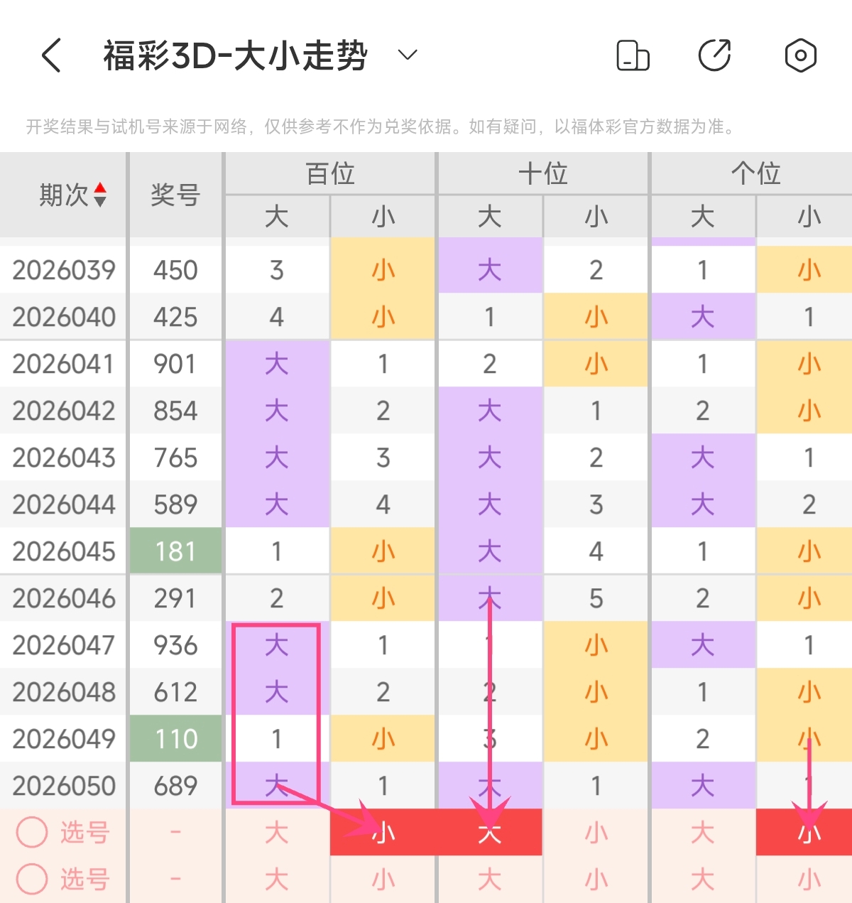 首先让我们回顾一下上期福彩3D第2026050期开奖号码为689,为组六形态,大小比为3:0,奇偶比为1:2,跨度为3,和值为23。