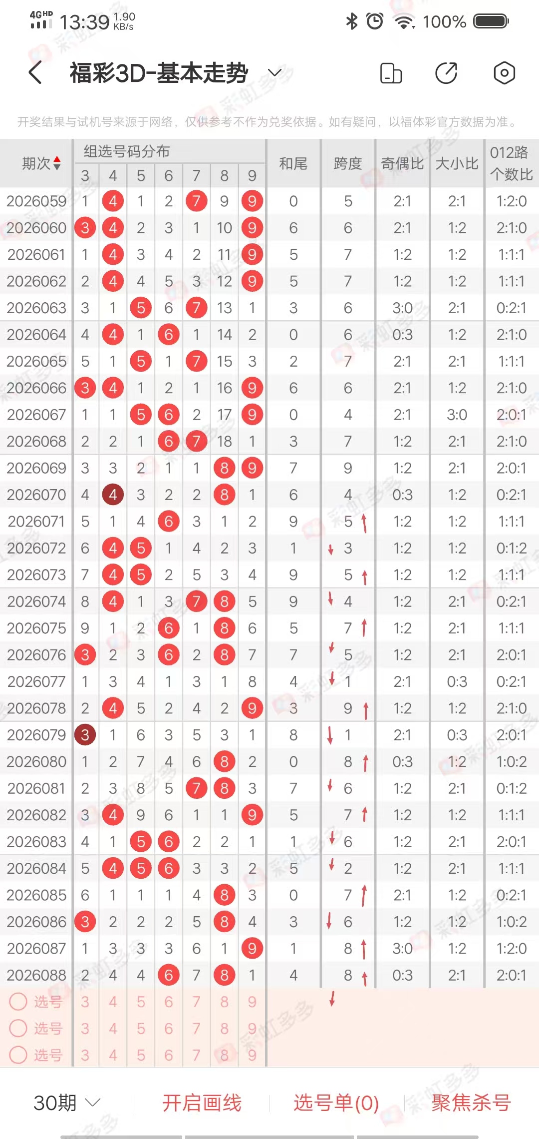 以上所有过滤条件并没有每期都是正确的,都是依靠各种数据环环相扣,总结出来的,我们在参考的时候,要抓住重点,比如和值小,大小1:2概率占大,比如跨度小,胆定小,那么789出现概率就小,9可以排除。当奇偶比或者大小比出现三期连出,第四期,很大概率是不出,尽量只做防守。
