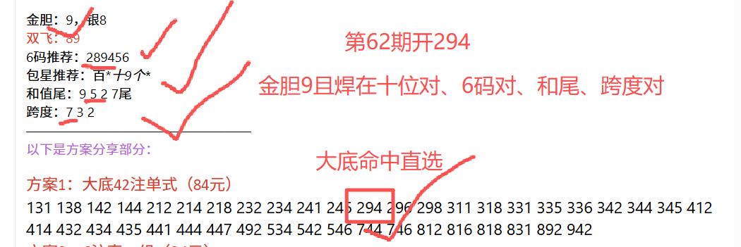 首先来看上期开奖号码为:294,和值为15.上期金胆推荐9且焊在十位对,命中直选