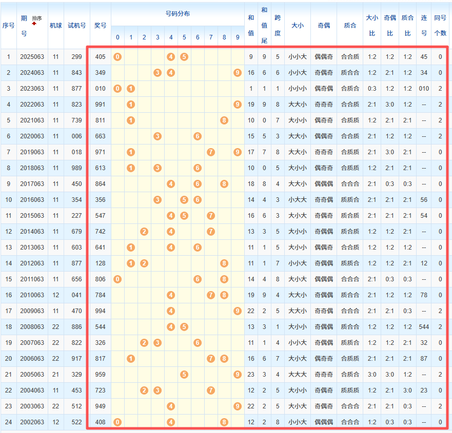 5、看连号(相连的号码)、同号个数(当期相同的号码 )