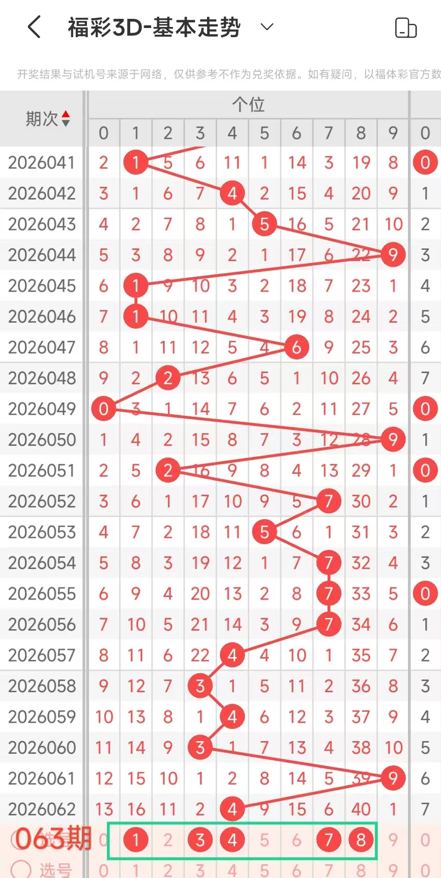 3、当个位开出4后下期开出:123312533,经统计0号出0次、1号出现2次、2号出现2次、3号出现4次、4号出现0次、5号出现1次、6号出现0次、7号出现0次、8号出现0次、9号出现0次。观察发现123号出现频繁,本期可以考虑。