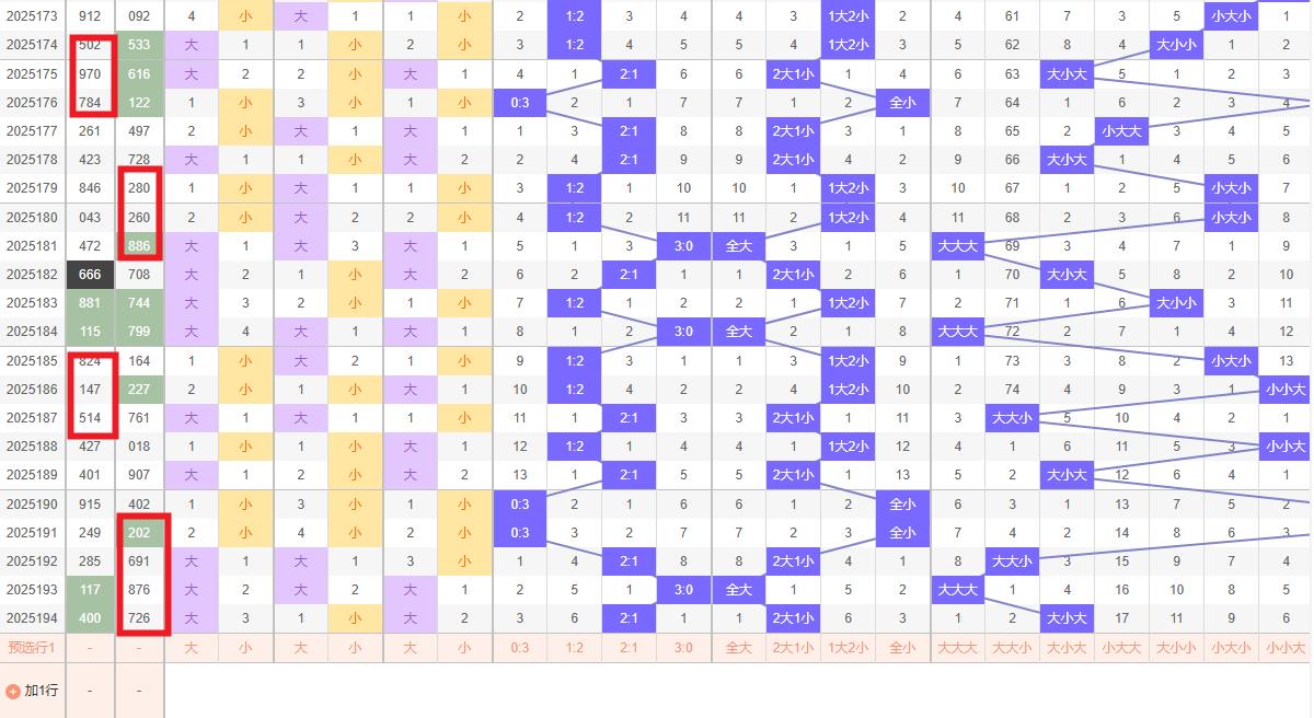 大小走势分析 - 大小比:上期开奖号码呈现大小大形态,即第一位大、第二位小、第三位大。综合近期大小号的波动趋势,建议本期重点关注大小比为1:2的组合。防全小