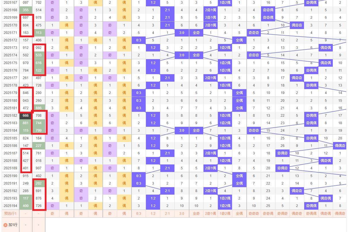 奇偶比例分析 - 奇偶比:上期号码726为奇偶偶形态,奇偶比例为1:2。结合历史数据与近期走势特征,本期可继续倾向于奇偶比为2:1的组合,即预测二位奇数搭配一位偶数。