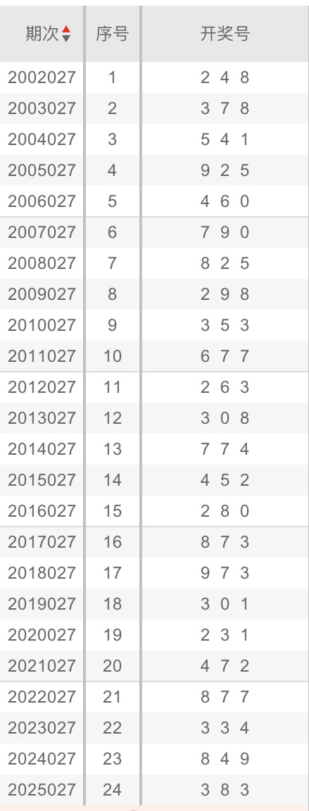 言归正传,分享第一个数据分析:统计历史同期开奖号码,依据追热不追冷的规律,出现次数最多的数字,大概率可以追热。以彩虹APP查询的历史同期开奖号码为例: