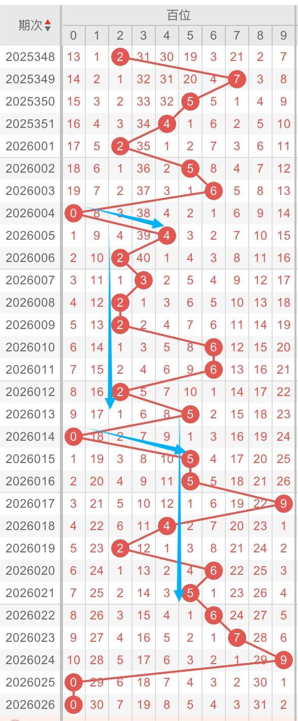 以近30期百位的走势形态分析:重复、跨度形态交替出现。例如:数字0-4/0-5跨度开出,数字2/5重复开出。本期重点关注:数字0-4/0-8跨度开出,同时关注数字2/5重复开出。个人分析,仅供参考。