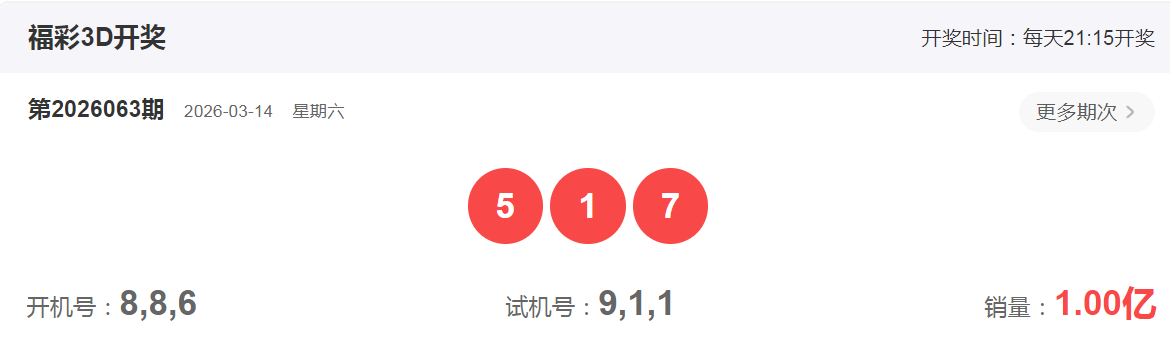 福彩3D2026年3月14日第063期开奖号码是517,组六形态,和值13,奇奇奇,大小大,跨度6