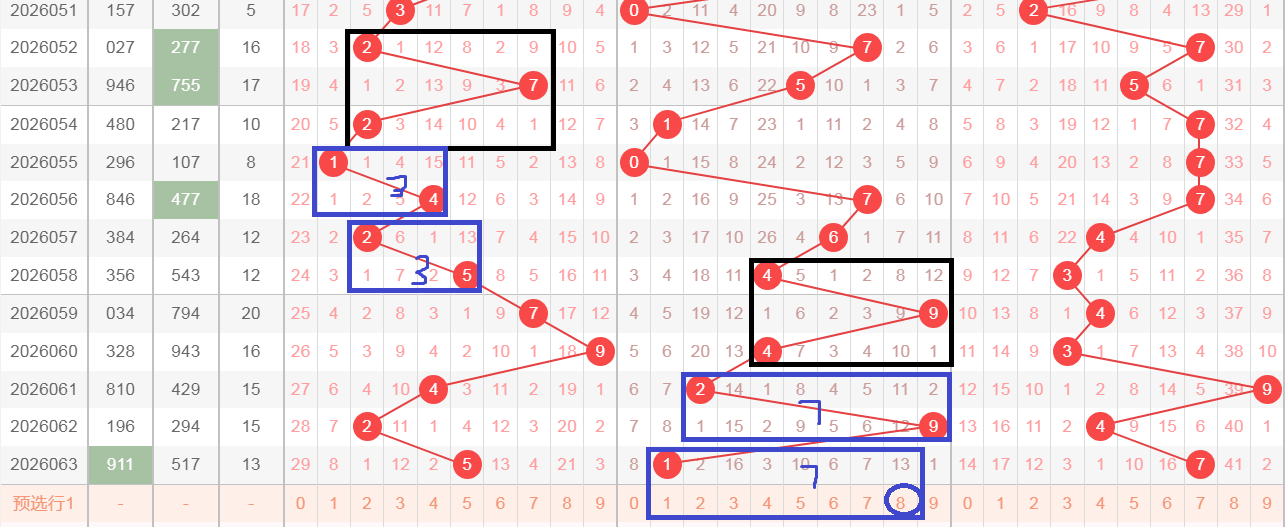 这是一张大盘走势分析图,利用百位来分析十位,这张走势图只是让大家参考一下,在百位开出了黑颜色框272的对应数等腰三角形,在十位同样也开出了黑颜色框494对应数等腰三角形,在百位黑颜色框272的下期开出了两个蓝颜色框分别是14和25,这两个蓝颜色框的两码差都是3,那么轮到今天,在十位先开出了蓝颜色框2和9,2和9两码差7,紧接着开出蓝颜色框1,1只有和8才能两码差7,文字表达不太清晰,大家可以观看上面的视频