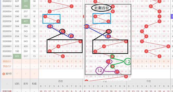 这是一张叠加图,利用近期百位来分析百位,近期百位开出了黑颜色5间隔一期942,当期百位同样也开出了黑颜色5间隔一期942,在两张图蓝颜色线条都是对应数,都是由小到大的排列方式,两张图青颜色框都是两码差3,都是由小到大的排列方式,文字表达不太清楚,大家可以观看上面的视频
