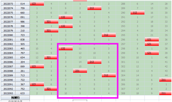 结合这个思路,我们就可以预判下未来几期3D位置形态走势了,我们看到上图方框内号码数据,在3D玩法里有4个位置形态,经常开出,然而这一次这4种形态一共同冷了4期,它们们分别是132、231、213、312,这4种位置形态,这4种位置形态就是两头小中间大的号码组合已经两头大中间小的位置组合,如果去选择3D单选号码,那么这4种位置形态必然是首选模式,中出的概率和空间就非常大了,这个就需要时间去验证,但是趋势是不会错误的。