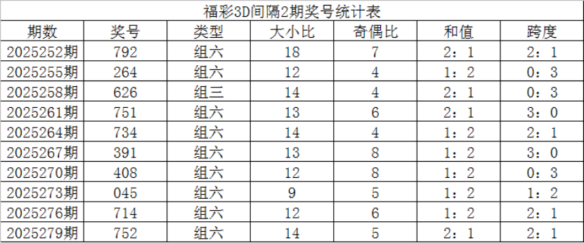 跨度分析:最近10期跨度分别开出:3543667532,跨度分布在2 - 7区间,振幅为6点,分布较广,其中跨度3出现3次,56出现2次,247出现1次,其余跨度没有出现,上期开出跨度2,走低1点,本期预计跨度走高,关注跨度5