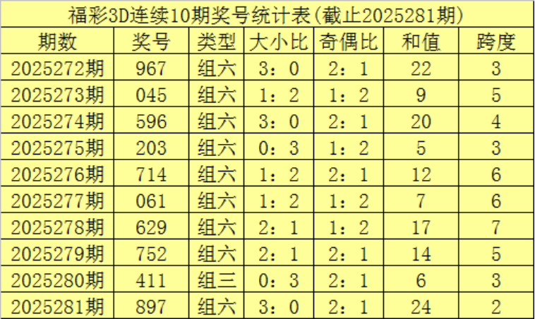 福利彩票3D25281期奖号开出897,奖号类型为组六,奇偶形态为偶奇奇,大小形态为大大大。
