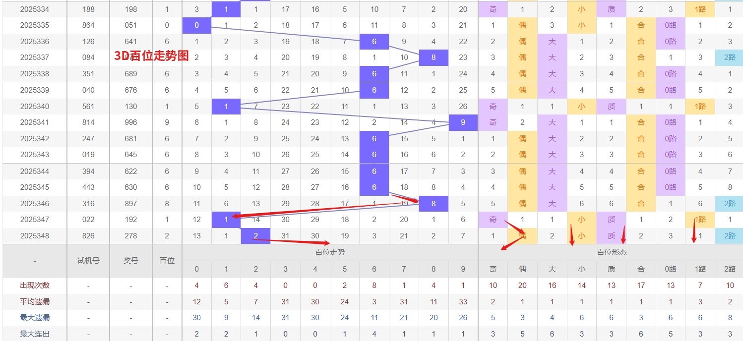 福彩3D百位分析:第2025348期百位开出号码2属于小偶数,从上面百位走势图上可以看出近100期大小比约为54:46奇偶比约为55:45。近期数据还是比较极端的符合文章开头介绍的求均衡规律非等量现象。但这种均衡不会持续最终会被偏态运行打破,然后循环往复。但短期内大小相差1点,大数过热小数有回补需求本期个人认为走小数的概率更高。上期百位落号“2”号球,在百位号码开出2路号码2后向大数方向走出1个振幅。那么通过分析上期百位落位号码分析,号码走出1个振幅,号码走为小偶数,开出2路号码2。通过对百位落号趋势来分析,百位号码落位前端,通过对近10期的走势来看百位号码大小交替频繁走3期大数又走2小数,3D百位近期走势,冷号4和7的遗漏值已累积至关键区间,尤其4在百位长期缺席后,其回补的潜在压力逐步增大;7同样在百位形成较深冷态,历史数据显示此类冷号往往在临近遗漏极限时出现反弹,需警惕其突然解冻。与此同时,热号6在百位表现活跃,形成较强的热度延续性,短期内仍有反复出现的可能。综合来看,当前百位正处于冷热交替的关键节点,防守冷号4、7回补的同时,对热号6的持续热度予以关注, 我们在百位关注的重点在04567这5个号码球上,百位号码近期奇偶切换频繁,2号球码属于2路号码偶数,现偶数开出过多有继续向偶数的趋势。所以福彩3D第2025349期百位看04567。