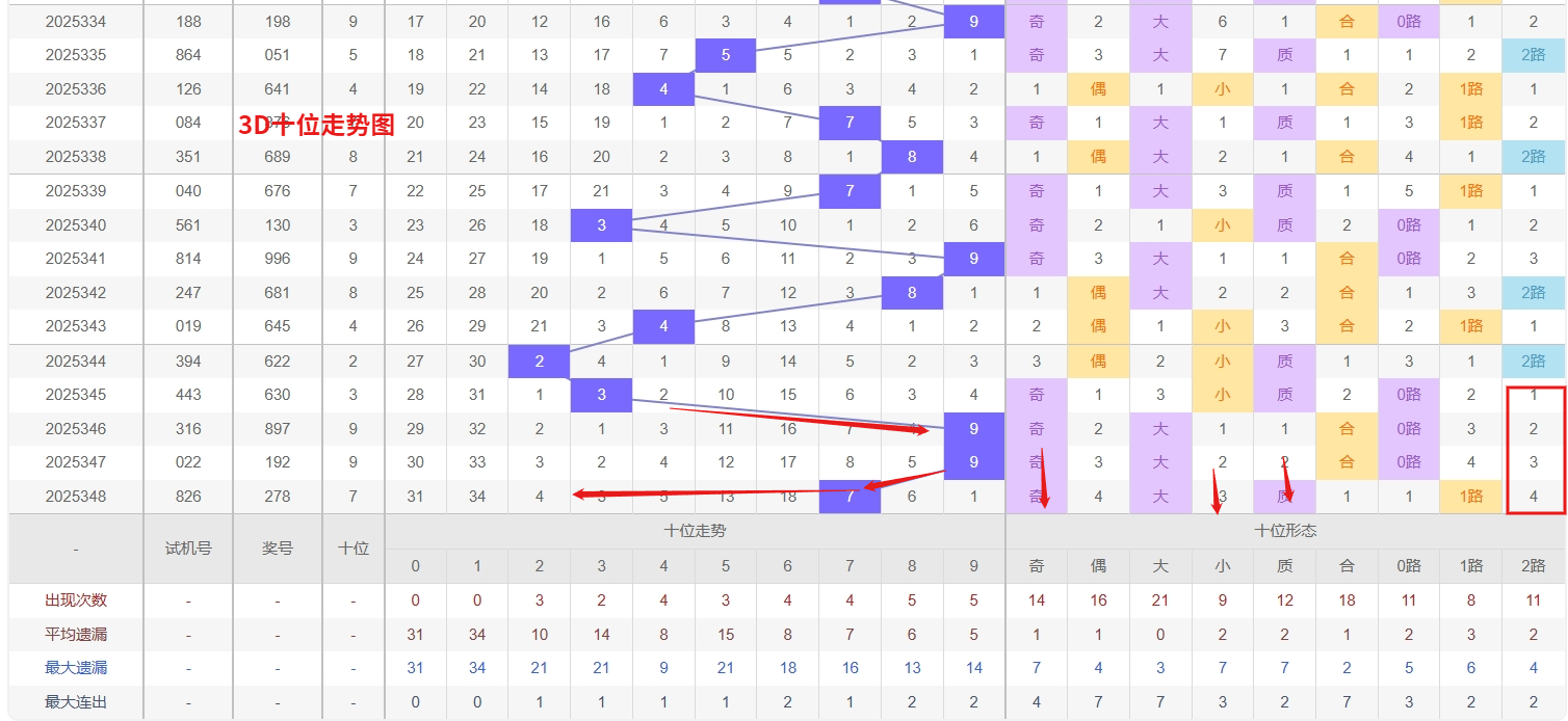 福彩3D十位分析:第2025348期十位开出号码7属大奇数号码后端。以历史100期数据为例十位奇偶比约为45比55,大小比约为53比47近期大小相差2点,根据求均衡的规律开出大数的概率比小数高一点。上期我们分析偶数经过连续回补后有走奇数的可能,开出奖号7大奇数符合我们的预期。3D十位近期走势,冷号0和1已进入回补敏感区间——0在十位遗漏周期拉长,渐近历史极值;1同样沉寂多期,冷态积蓄的反弹能量逐步增强,需密切关注其解冻信号。与此同时,热号6在十位表现活跃,形成连续或间隔出现的热度趋势,短期内仍有较强的延续可能。所以福彩3D第2025349期十位推荐01346。