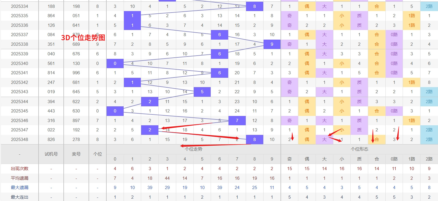 福彩3D个位分析:第2025348期个位开出号码8于大偶数后端,从以上个位走势图中可以看出近100期的大小比约为45:55奇偶比约为52:48大小奇偶数据上有点差异有需求但不是太明显,不太好看这时就要借助连线走势和遗漏数据来帮助我们缩水号码。上期个位落号“8”大偶数2路号码球,号码开出了6振幅,连续多期的小振必被大振幅取代幅符合我们的预期,那么本期我们在个位考虑振幅走势走前依然要转变思路考虑大振幅,具体考虑(1-5)个振幅是我们主要的方向,那么在对个位落号情况进行系统的分析时我们可以明显的看到个位号码走势呈现大范围震荡,尤其是在号码的落位特点上表现的尤为突出,那么本期我们在个位分析时就要注意号码的风险,避免出现踏空。3D个位近期走势,热号1表现极为活跃,已形成明显的热度聚集态势,其在个位多次间隔开出后,近期呈现出较强的延续性,存在连下或频繁回补的可能,需重点关注其热态惯性。与此同时,冷号9在个位遗漏周期已拉长至关键阶段,因此福彩3D第2025349期个位看好12579。