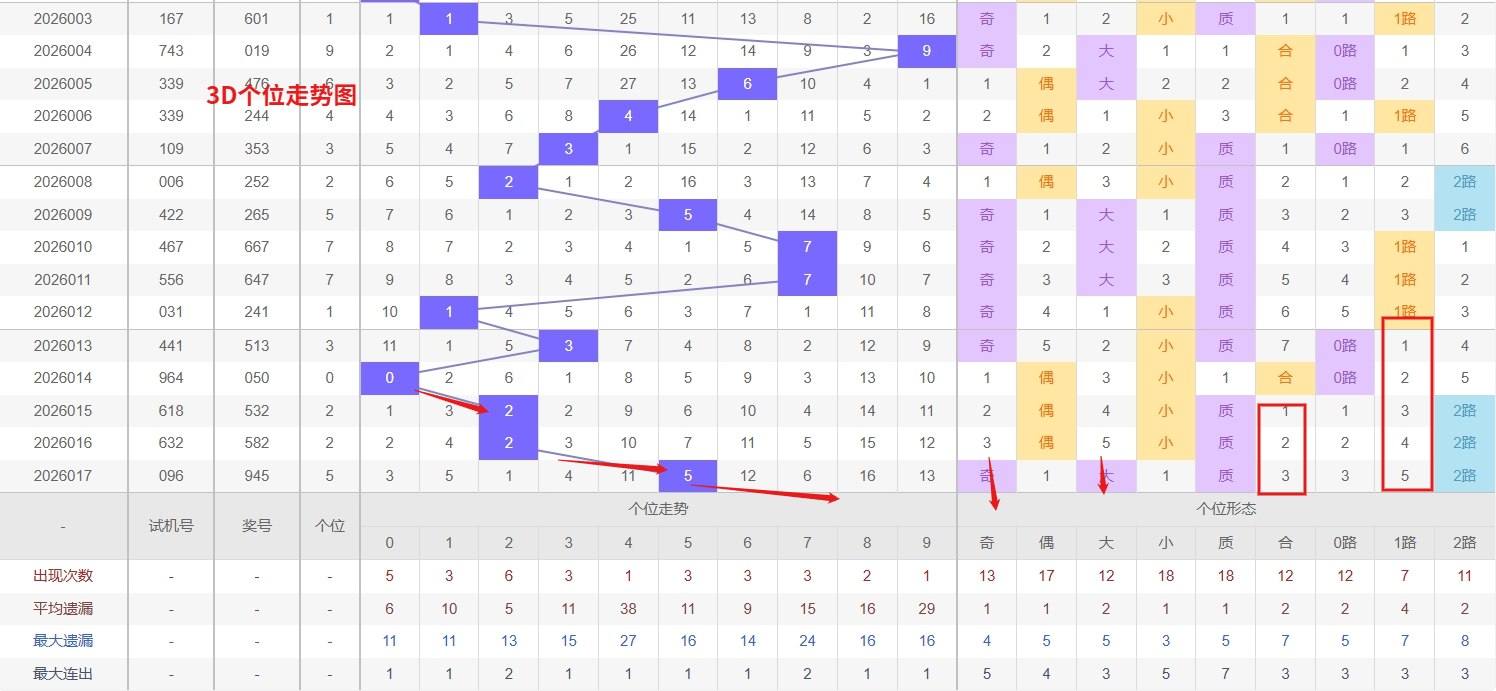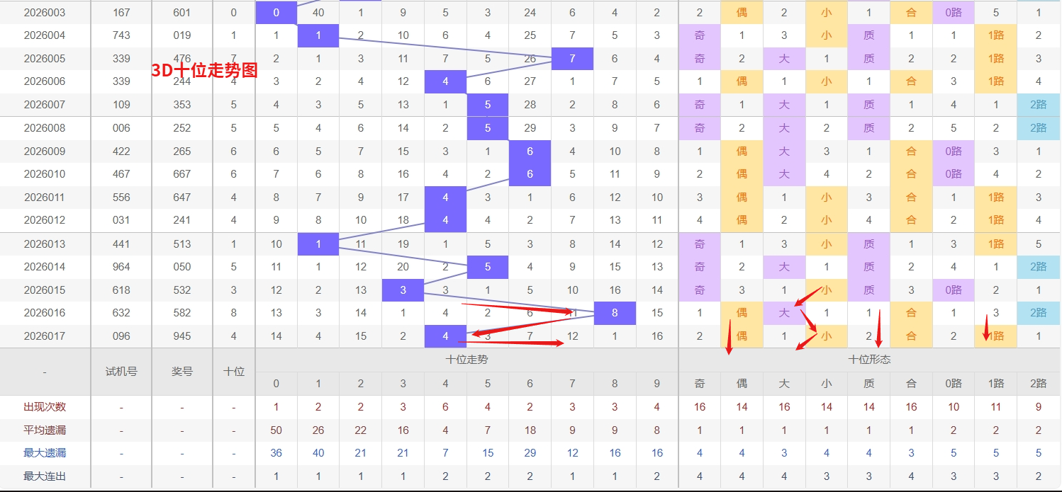 福彩3D百位分析:第2026017期百位开出号码9属于大奇数,从上面百位走势图上可以看出近100期大小比约为54:46奇偶比约为53:47。近期数据还是比较极端的符合文章开头介绍的求均衡规律非等量现象。但这种均衡不会持续最终会被偏态运行打破,然后循环往复。但短期内大小相差4点,小数过热大数有回补需求本期个人认为走大数的概率更高。上期百位落号“9”号球,在百位号码开出0路号码9后向大数方向走出4个振幅。那么通过分析上期百位落位号码分析,号码走出4个振幅,号码走为大奇数,开出0路号码9。通过对百位落号趋势来分析,百位号码落位后端,通过对近10期的走势来看百位号码大小交替频繁走3期大数又走2小数,3D百位近期走势来看,数字7和9均已进入明显的冷态,分别遗漏长达21期和26期,远超理论遗漏值。这种深度遗漏往往累积了较强的技术性回补压力,尤其是在百位号码分布趋向平衡的阶段,冷号回补的需求正在持续增强。尽管不能断言具体回补时点,但从历史数据观察,此类长期遗漏的号码一旦回补,往往可能伴随短期内的集中出现。因此,近期在关注热号的同时,对百位冷号7和9给予足够重视,我们在百位关注的重点在03467这5个号码球上,百位号码近期奇偶切换频繁,9号球码属于0路号码奇数,现奇数开出过多有向偶数的趋势。所以福彩3D第2026018期百位看03467。