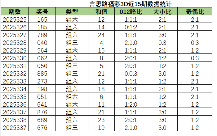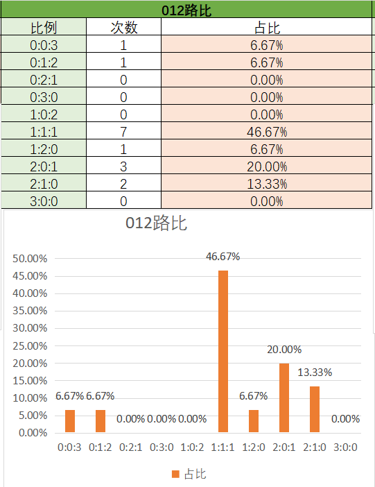 上期012路比是2:1:0,各个类型占比没有变化。近15期内,1:1:1是开出最多的,次之是2:0:1,然后是2:1:0,最后是0:1:2,1:2:0,0:0:3。总的看0路最热门,其次是1路,最后是2路,本期看好1:1:1和0:2:1。