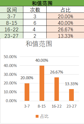 上期和值是19,处在16~22之间,其中16~22占比变大,8~15占比变小。目前是8~15的和值占比是最多的,优势是最好的,次之是16~22,然后3~7,最后是23~27。本期看好和值在8~15之间,其次是16~22。